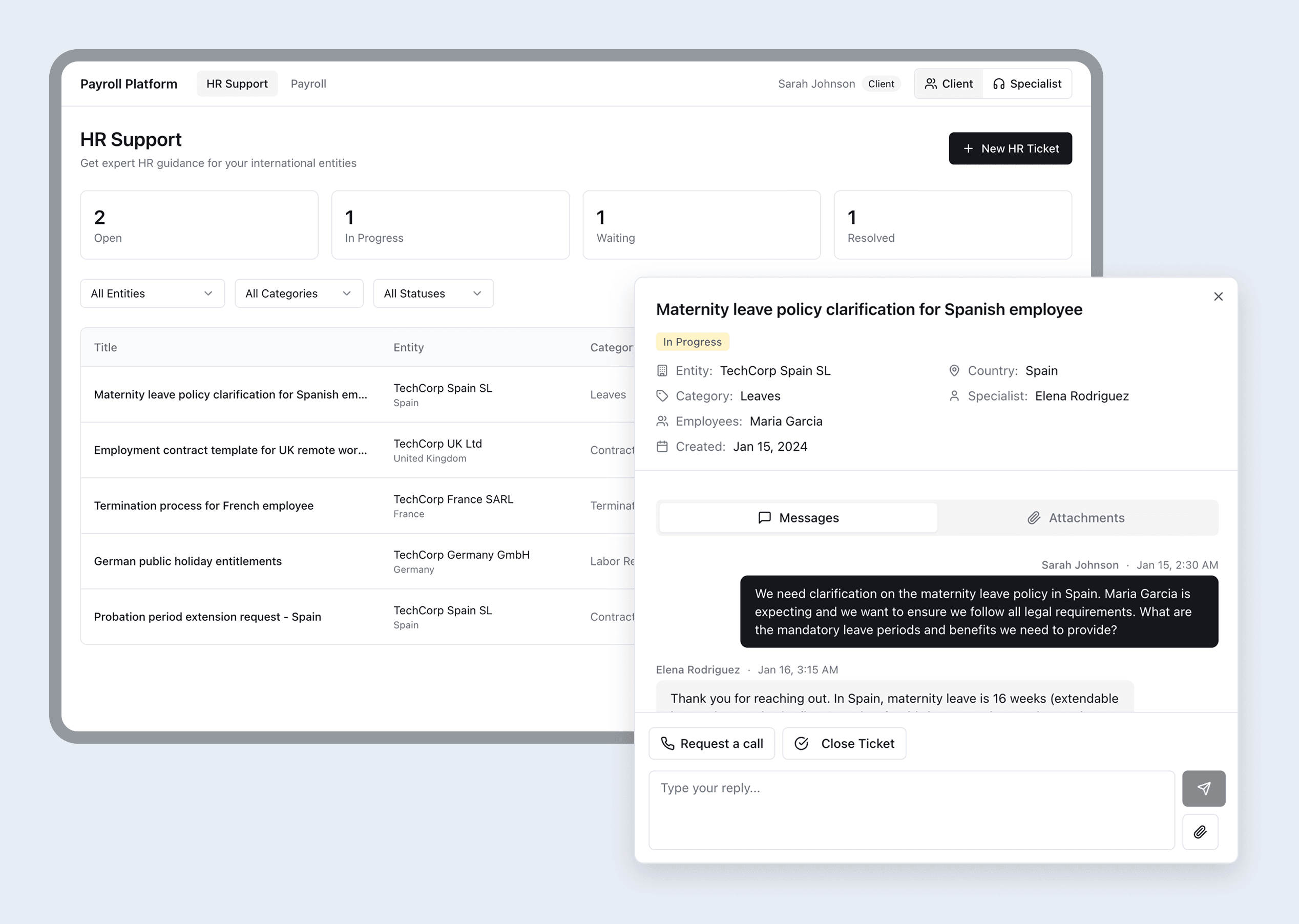 As the Product Designer I designed a 0 to 1 HR ticketing system within a payroll platform. The goal was to enable payroll clients to access reliable, compliant HR support in countries where they operated without a local HR team.