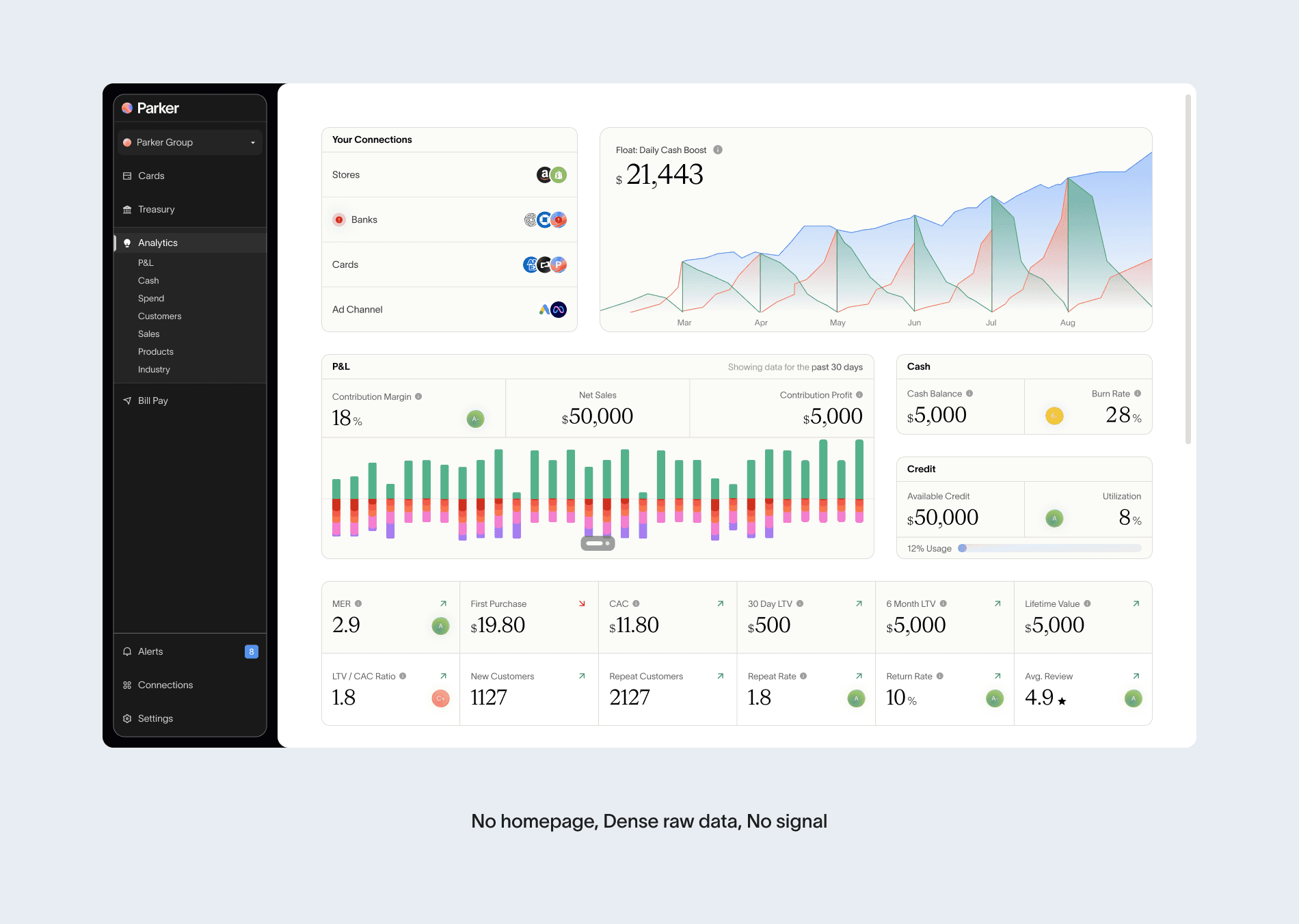 Parker's previous platform had no home page. Users landed directly into a raw analytics screen — charts and numbers with no context, no prioritization, and no clear signal of what needed attention. The platform was being used as a credit tool, not as a financial operating system.