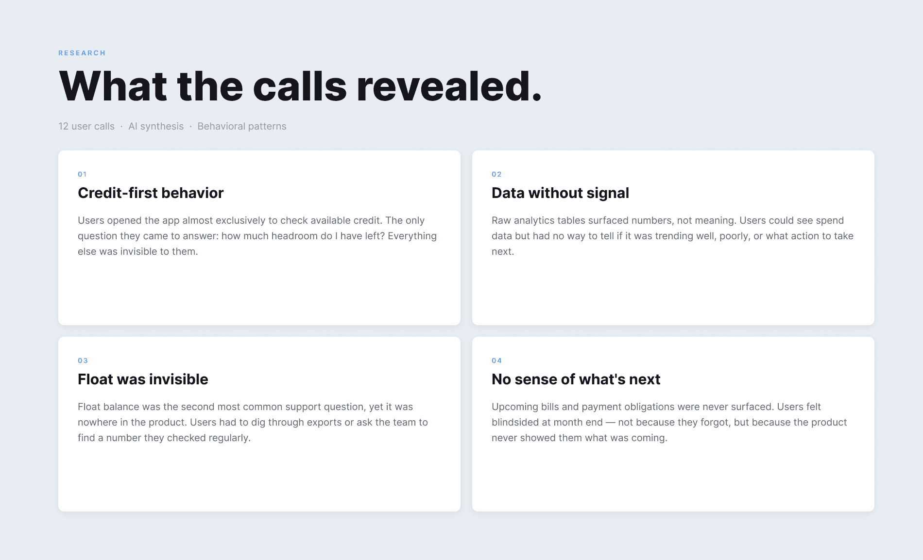 Credit utilization, float cash position, pending tasks, and top expenses by category and user. These weren't arbitrary — each one mapped directly to a question customers were asking in support and sales calls.