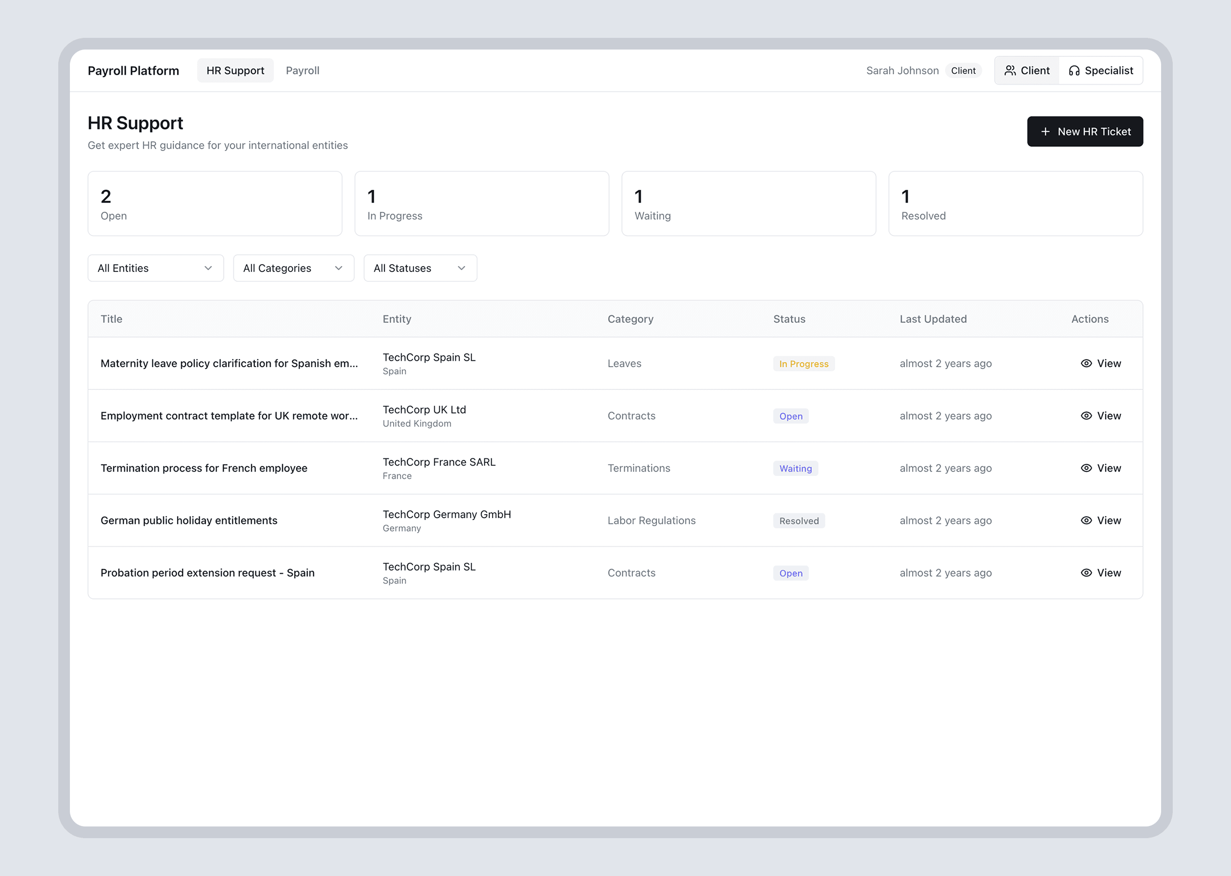 As the Product Designer I designed a 0 to 1 HR ticketing system within a payroll platform. The goal was to enable payroll clients to access reliable, compliant HR support in countries where they operated without a local HR team.